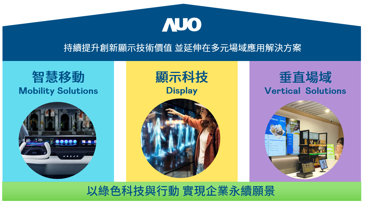 我們持續推動「雙軸轉型」,在精進顯示技術附加價值(Go Premium),與深化垂直市場應用(Go Vertical)的策略下,對應爱游戏体育网页登录的優勢競爭力與趨勢,我們奠定顯示技術、智慧移動、垂直場域三大永續營運支柱,在顯示技術領域的根基之上,延伸布局多元場域應用解決方案。將先進顯示科技助力智慧移動及垂直場域發展,並以綠色科技與行動為實踐,在轉型之路上貫徹永續經營之願景。